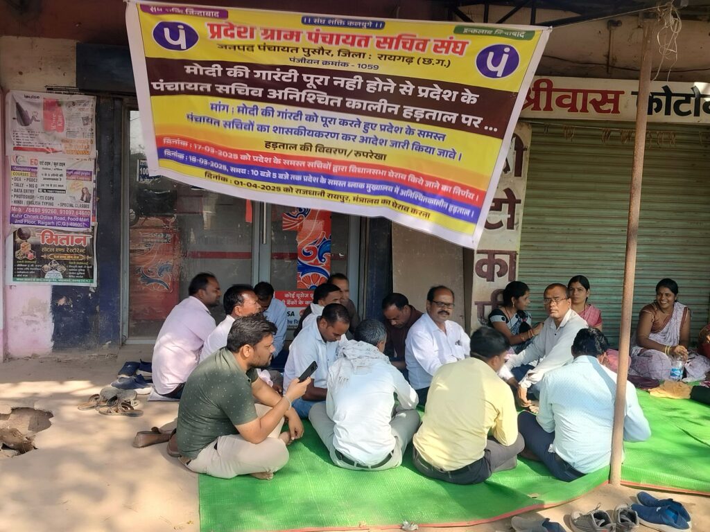 रायगढ़ पूसौर / प्रदेश ग्राम पंचायत सचिव संघ द्वारा प्रदेश स्तर पर मोदी जी के गारंटी को पूरा नहीं करने पर प्रदेश सरकार को सभी सचिवों को शासकीय करण करने वादे पूरे करने उद्देश्य अनिश्चित कालीन हड़ताल कर रही है जिसमे पूसौर सचिव ब्लॉक अध्यक्ष लक्ष्मी साव जी के साथ सैकड़ों सचिव के साथ हड़ताल पर बैठे हैं जहां इंडियन क्राइम न्यूज नेशन व रायगढ़ माटी के रिपोर्टर द्वारा पूछे जाने पर लक्ष्मी साव ने कहा सरकार के द्वारा किया गया घोषणा पत्र नियमति शासकीय करण की मांग कर रहे हैं पर बार बार सरकार द्वारा आंदोलन वापस लेने के लिए दबाव बनाया जाता है इस बार आर पार की बात होगी जो भी हो हमारे सचिवों की मांग को लेकर छल कपट नहीं होने देंगे जब तक मांग पूरी नहीं होगी आंदोलन और उग्र होगा देखना अब ये होगा विष्णुदेव की सरकार किये गए वादों पर कितना खरा उतरती है या अपने प्रसाशनिक ताकत से आंदोलन को कुचलने के प्रयास करेगी l