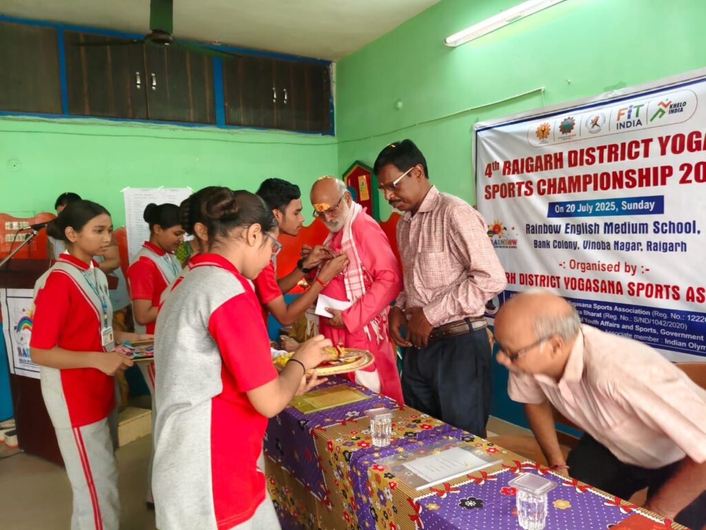 रायगढ़ जिला योगासन स्पोर्ट्स एसोसिएशन. रेंबो इंग्लिश मीडियम के सयुंक्त तत्वाधान बलबीर शर्मा पूर्व डिप्टी डायरेक्टर एन वाय के भारत सरकार के मुख्य आथित्य सम्पन्न हुआ गरिमामय आयोजन मे जिले से पधारे सभी योगासन के खिलाड़ियों को मुख्य अतिथियों द्वारा प्रोत्साहित करते हुए पदक प्राप्त करने वाले खिलाड़ियों एवं कोच को मेडल मोमेंटो सर्टिफिकेट देते हुए उनके उज्जवल भविष्य कि कामना की गई l
