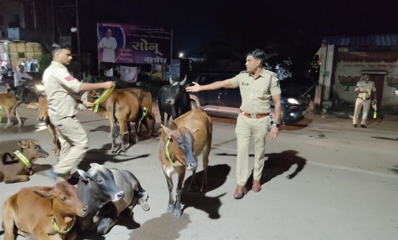 सड़क सुरक्षा अभियान के तहत *घरघोड़ा थाना प्रभारी निरीक्षक कुमार गौरव साहू* के नेतृत्व में मवेशियों के गले में लगाए गए रेडियम कॉलर टैग