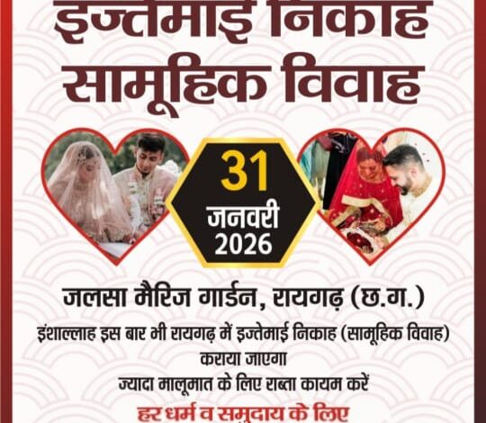 छत्तीसगढ़ रायगढ़ /31 जनवरी को आयोजित होने जा रहे इज्तेमाई निकाह एवं सामूहिक विवाह समारोह इस वर्ष सामाजिक समरसता और सर्वधर्म सद्भाव की अनोखी मिसाल पेश करेगा रायगढ़ स्थित जलसा मैरिज गार्डन में यह भव्य आयोजन होने जा रहा है। दिवतीय वर्ष में प्रवेश कर चुके इस आयोजन का नेतृत्व आल मुस्लिम वेलफेयर फ़ाउंडेशन बिलासपुर संभाग अध्यक्ष एवं आयोजन संयोजक शेख अतहर हुसैन कर रहे हैं, जिनकी पहल जरूरतमंद परिवारों के चेहरों पर मुस्कान लाने का बड़ा माध्यम बन रही है।