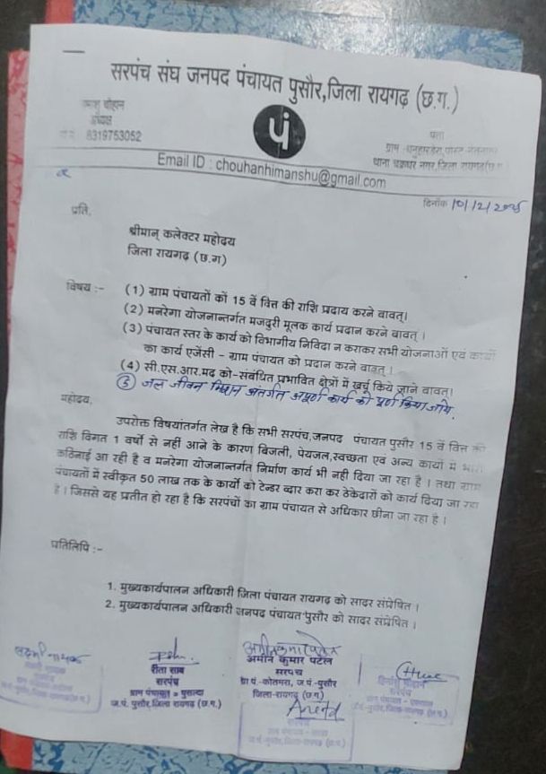 पुसौर रायगढ़ क्षेत्र के सरपंच संघ ने 15वीं वित्त राशि अब तक जारी न होने पर कड़ा विरोध दर्ज कराया है। सरपंचों का आरोप है कि ग्राम पंचायतों के मूल अधिकारों को नजरअंदाज करते हुए उनके कार्यों को टेंडर प्रक्रिया से बाहर के ठेकेदारों को दिया जा रहा है, जिससे स्थानीय विकास कार्य प्रभावित हो रहे हैं। साथ ही, सीएसआर मद से होने वाले कार्य भी पंचायतों को न दिए जाने के कारण गांवों की आवश्यक योजनाएँ अधर में लटकी हुई हैं।