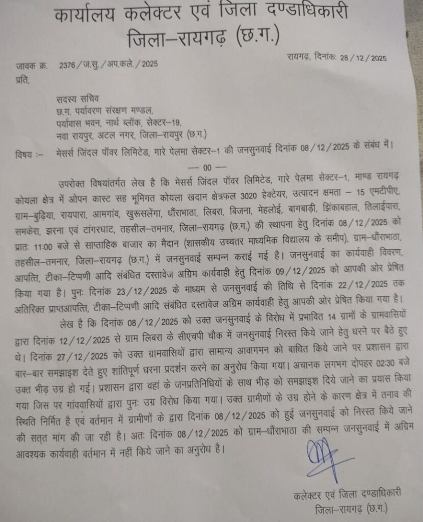 जनता के दबाव में प्रशासन का बड़ा फैसला, जिंदल जनसुनवाई निरस्त करने कलेक्टर ने भेजा पत्र