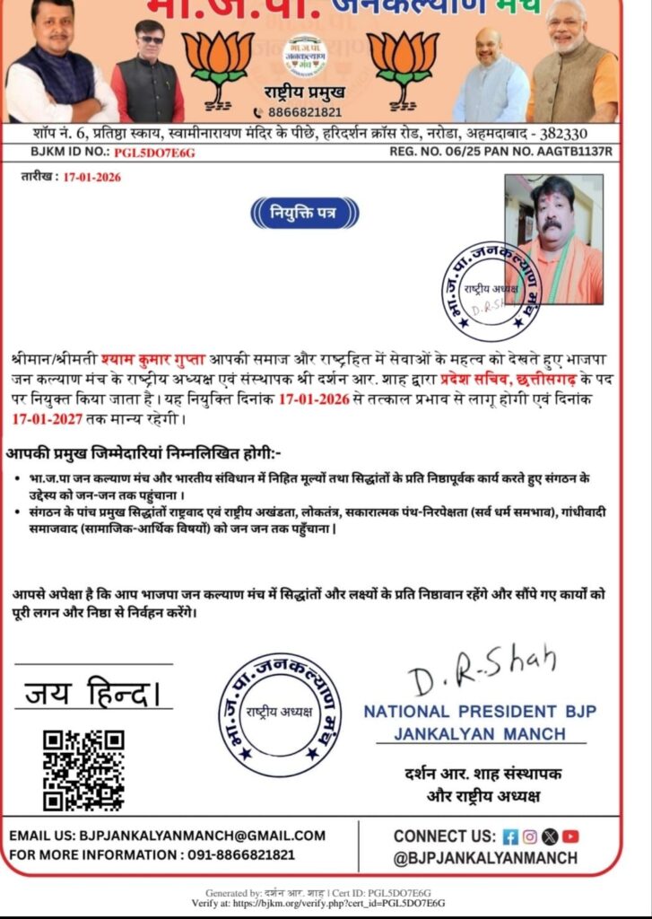 भाजपा जनकल्याण मंच का संगठनात्मक विस्तार, प्रदेश व जिला स्तर पर नई नियुक्तियाँ