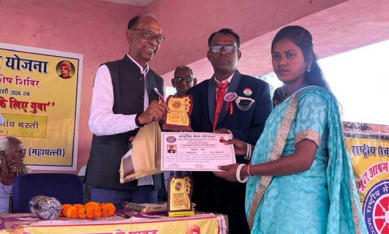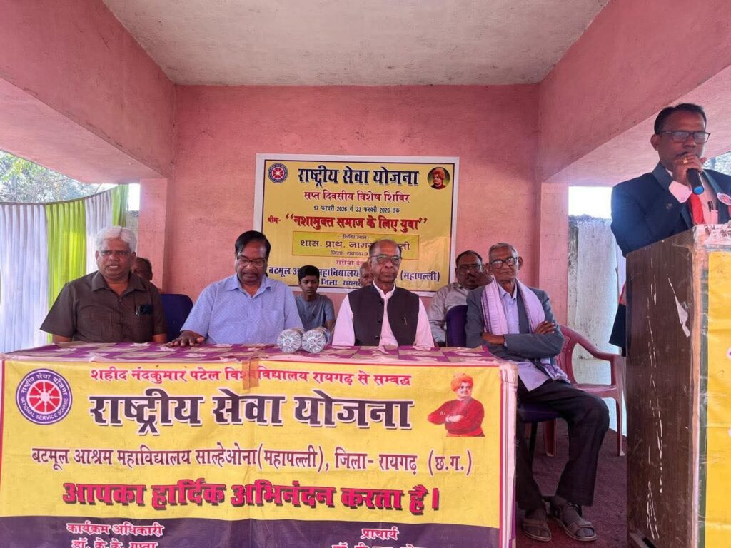 रायगढ़ – शहीद नंदकुमार पटेल विश्वविद्यालय रायगढ़ से संबद्ध बटमूल आश्रम महाविद्यालय साल्हेओना महापल्ली के प्राचार्य डॉ. पी. एल. पटेल, महाविद्यालय समिति संचालन समिति के अध्यक्ष एन.आर.प्रधान जी के मार्गदर्शन एवं राष्ट्रीय सेवा योजना कार्यक्रम अधिकारी डॉ. के. के. गुप्ता के कुशल नेतृत्व में बटमूल आश्रम महाविद्यालय के राष्ट्रीय सेवा योजना इकाई के साथ दिवसीय विशेष शिविर का आयोजन जामगांव के शासकीय प्राथमिक विद्यालय परिसर में 17 फरवरी से 23 फरवरी 2026 तक ग्राम जामगांव में किया गया। रासेयो शिविर के समापन समारोह रायगढ़ विधानसभा क्षेत्र के पूर्व विधायक विजय अग्रवाल जी के मुख्य आतिथ्य में सम्पन्न हुआ। सर्वप्रथम मुख्य अतिथि एवं मंचस्थ अतिथियों द्वारा युवाओं के प्रेरणा स्रोत स्वामी विवेकानंद जी के छायाचित्र के समक्ष दीप प्रज्वलित एवं माल्यार्पण कर कार्यक्रम का शुभारंभ किया। तत्पश्चात मंचस्थ अतिथियों का एन.एस.एस. बैच लगाकर एवं पुष्पगुच्छ और माला से स्वागत अभिनंदन किया गया। स्वयंसेवक छात्राओं द्वारा स्वागत गीत एवं सामूहिक स्वागत नृत्य की प्रस्तुति दी गई। उसके बाद कार्यक्रम अधिकारी डॉ के के गुप्ता द्वारा मुख्य अतिथि पूर्व विधायक विजय अग्रवाल जी का साल एवं स्मृति चिन्ह भेंट कर सम्मानित किया। कार्यक्रम अधिकारी डॉ. के के गुप्ता ने सात दिवसीय विशेष शिविर प्रतिवेदन में कार्य योजना के तहत किए गए कार्यों को विस्तार से बताया। मुख्य अतिथि पूर्व विधायक विजय अग्रवाल ने समापन शिविर को संबोधित करते हुए कहा कि एनएसएस शिविर में छात्र छात्राओं को स्वच्छता का महत्व बताया और कहा कि स्वच्छ भारत में ही स्वच्छ भारत निवास करता है अतः हम सभी को स्वच्छता को अपनी दिनचर्या का अभिन्न अंग बना लेना चाहिए। उन्होंने कहा कि राष्ट्रीय सेवा योजना विद्यार्थियों में सेवा अनुशासन एवं सामाजिक उत्तरदायित्व की भावना विकसित करती है। उन्होंने स्वयंसेवकों को समाज हित में निष्ठा पूर्वक कार्य करने तथा शिविर की गतिविधियों से अधिकतम लाभ उठाने हेतु प्रेरित किया। कार्यक्रम अधिकारी डॉ. के के गुप्ता के नेतृत्व में शिविरार्थियों का अनुशासन एवं समाज सेवा के प्रति समर्पण अत्यंत प्रेरणादायी रहा। ऐसे शिविर विद्यार्थियों में सेवा, संस्कार और नेतृत्व क्षमता का विकास करते हैं तथा समाज के प्रति जिम्मेदारी का भाव जागृत करते हैं। इस अवसर पर महाविद्यालय के प्राचार्य डॉ पी एल पटेल ने विशेष शिविर आयोजन के उद्देश्य को बताया। महाविद्यालय संचालन समिति के अध्यक्ष श्री एन आर प्रधान, सचिव दशरथ गुप्ता, मुरारी अग्रवाल, सरपंच प्रमोद कुमार चौहान, प्यारीलाल गुप्ता, संतोष राम चौहान ने आशीर्वचन प्रदान किया। सहायक कार्यक्रम अधिका