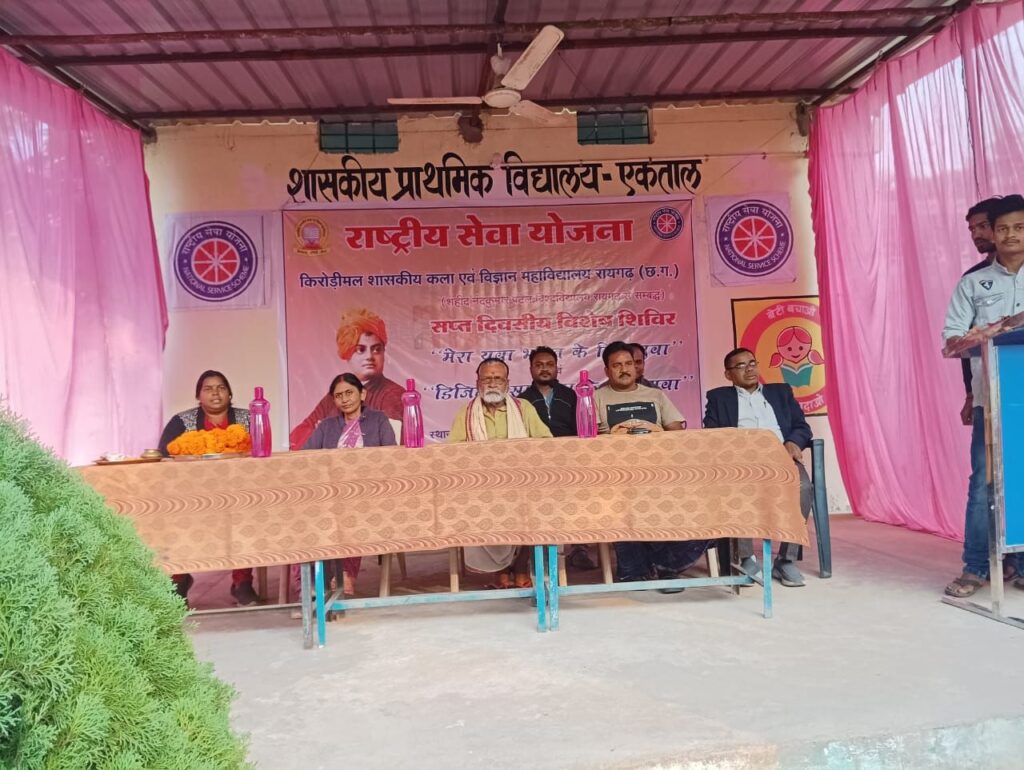 रायगढ़ / पूसौर विकास खण्ड एकताल ग्राम पंचायत में किरोड़ीमल शासकीय कला एवं विज्ञान महाविद्यालय रायगढ़ के द्वारा माध्यमिक शाला भवन में राष्ट्रीय सेवा योजना शिविर का उद्घाटन 11 दिसंबर से 17 दिसंबर तक शिविर का आयोजन किया गया जिसके उद्घाटन समारोह में साला विकास समिति के अध्यक्ष श्री अग्नि पांडा के एवं एन एस एस कार्यक्रमों के प्रभारी के मुख्य आतिथ्य में किया गया जो राष्ट्रीय विचार धारा के साथ साथ सामाजिक सेवा अनुशासन समर्पण कार्यक्रम के माध्यम सन्देश होगा l