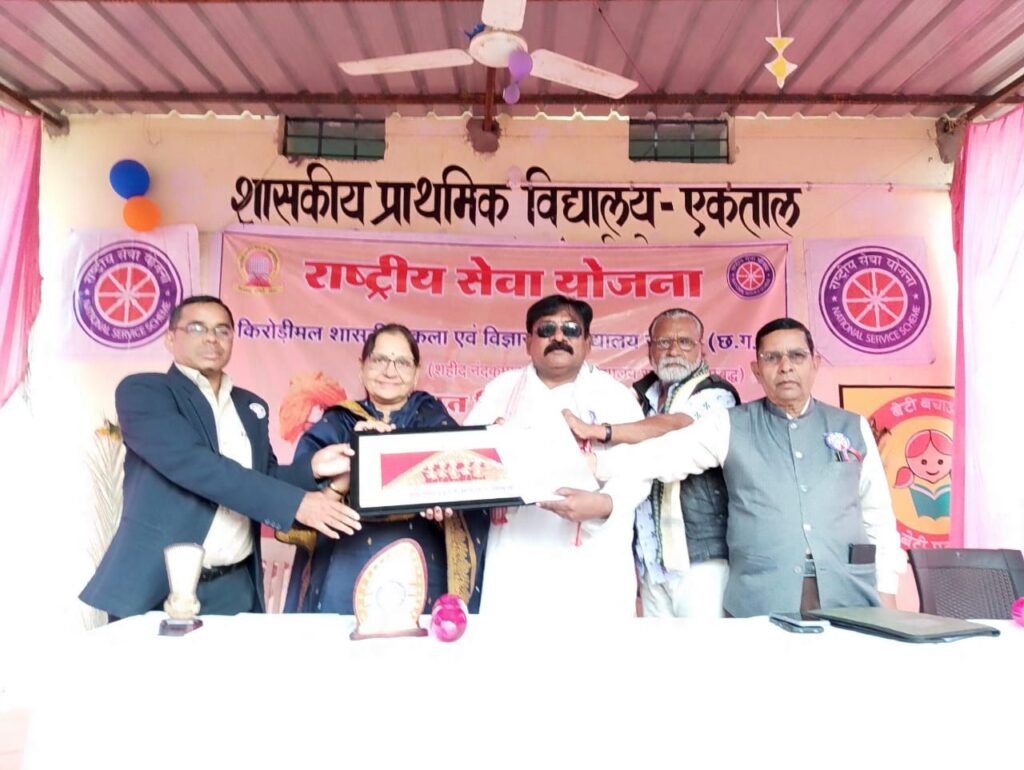किरोड़ीमल शासकीय कला एवं विज्ञान महाविद्यालय रायगढ़ के राष्ट्रीय सेवा योजना इकाई द्वारा 11 से 17 दिसंबर तक “मेरा युवा भारत के लिए युवा “तथा डिजिटल साक्षरता के लिए युवा थीम पर ग्राम एकताल में आयोजित सप्त दिवसीय विशेष शिविर का समापन 17दिसंबर को श्री श्याम कुमार गुप्ता संस्थापक, राष्ट्रीय अध्यक्ष, नागरिक सुरक्षा सेवा संगठन एवं अंतरराष्ट्रीय मार्शल आर्ट खिलाडी एवं कोच के मुख्य आतिथ्य श्री अग्नि पंडा अध्यक्ष, शाला विकास समिति, श्री गोकुल पंडा पूर्व प्रधानपाठक के विशिष्ट आतिथ्य एवं प्राचार्य एवं शिविर के संरक्षक डॉ. मनोरमा पाण्डेय की अध्यक्षता में हुआ.