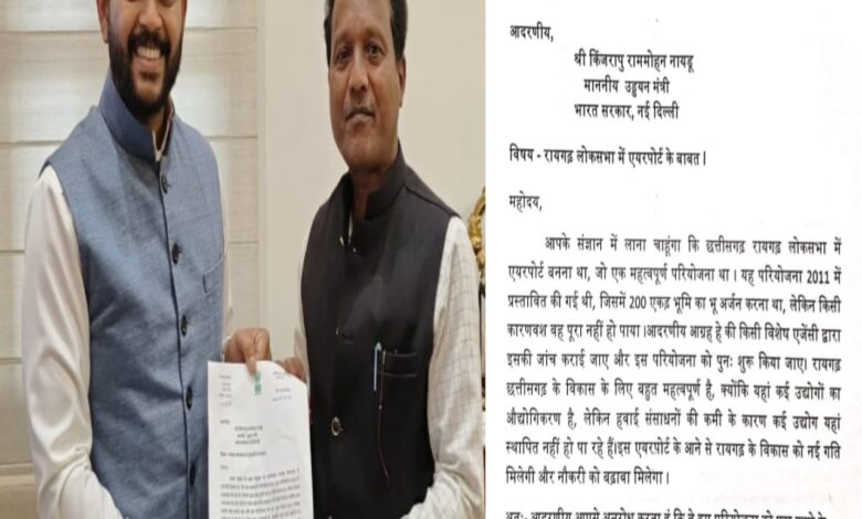 रायगढ़ लोकसभा में एयरपोर्ट परियोजना को पूरा करने के लिए आवश्यक कदम उठाने सांसद राधेश्याम राठिया ने उड्डयन मंत्री को सौंपा पत्र।