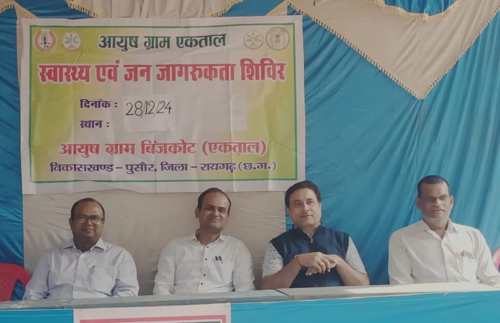 रायगढ़ /आज दिनाँक 28/12/24 को रायगढ़ के पुसौर विकासखंड के आयुष ग्राम एकताल में जिला आयुष अधिकारी डॉ मीरा भगत मैडम के दिशानिर्देशन में त्रेमासिक स्वास्थ्य शिविर का आयोजन किया गया जिसमें 158 मरीजों का परीक्षण करते हुए उन्हें निःशुल्क आयुर्वेद औषधियां प्रदान की गईं एवं नशामुक्ति से संबंधित जनजागरूकता प्रदान की गई साथ ही निःशुल्क रक्त जांच की गई एवं वय वंदना कार्ड बनाये गए।