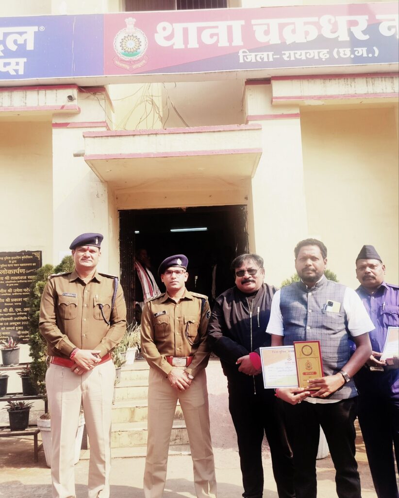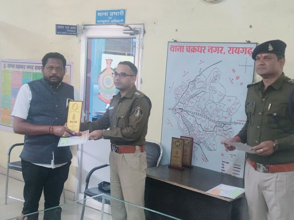 रायगढ़ / चाहे एक्सीडेंट से घायलों को हॉस्पिटल पहुंचाने उन्हें सहयोग करने की बात हो या उन्हें अन्य सहयोग करने की बात हो या पुलिस विभाग से संबंधित शान्ति व्यवस्था अन्य सहयोग में हमेशा सहयोग करवाने की बात हो एकताल ग्राम पंचायत के पंच एवं सरपंच पति सामाजिक कार्यकर्ता नागरिक सुरक्षा सेवा संगठन के राष्ट्रीय युवा अध्यक्ष हिमांशु चौहान को आज पुलिस थाना चक्रधर नगर सम्मान समारोह में आई पी एस ऑफिसर आकाश शुक्ला जी थाना प्रभारी प्रशांत राव जी के हाथों सम्मानित किया गया यह गरीमा अवसर जिले विख्यात सामाजिक कार्यकर्ता नागरिक सुरक्षा सेवा संगठन के संस्थापक रेन्शी श्याम कुमार गुप्ता उपस्थित थे उनके साथ साथ नागरिक सुरक्षा सेवा संगठन के संरक्षक बलबीर शर्मा पूर्व डिप्टी डायरेक्टर भारत सरकार के साथ साथ सभी हिमांशु चौहान के चाहने वाले ने हार्दिक शुभकामनाएं दी l